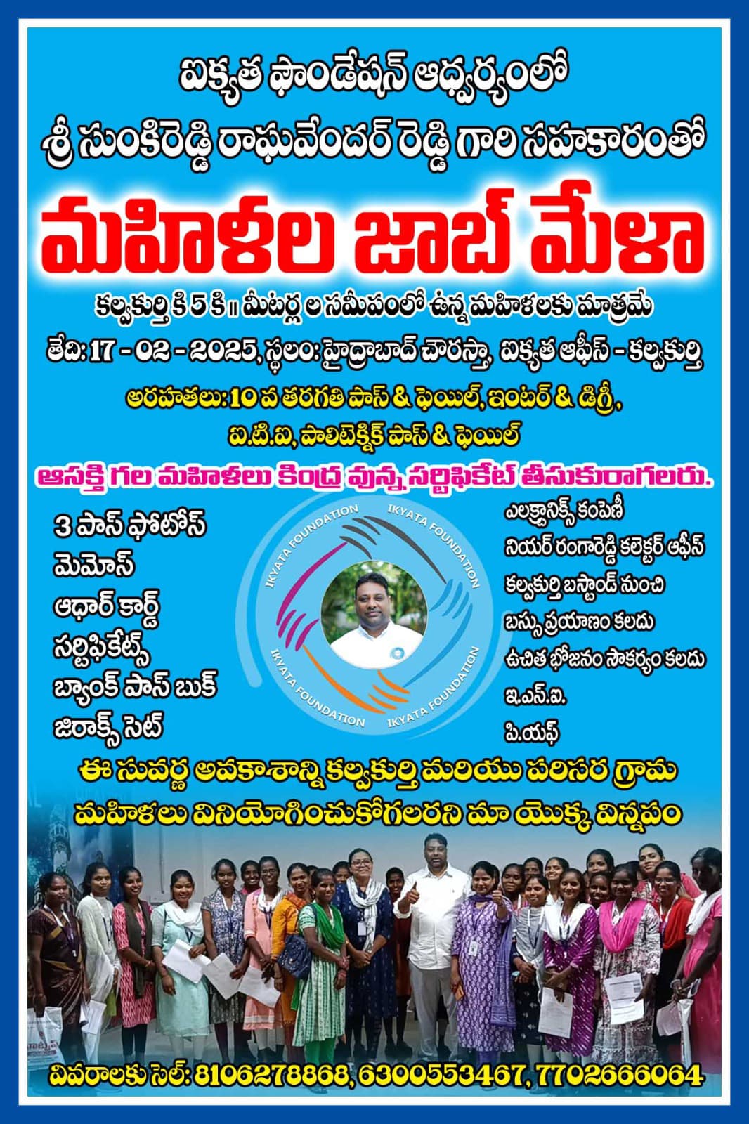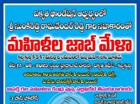 ఐక్యత ఫౌండేషన్ ఆధ్వర్యంలో, సుంకిరెడ్డి రాఘవేందర్ రెడ్డి సహకారంతో మహిళల కోసం ప్రత్యేక జాబ్ మేళా నిర్వహించబడుతోంది.ముఖ్యమైన అర్హతలు.పదవ తరగతి (పాస్/ఫెయిల్), ఇంటర్మీడియట్, డిగ్రీ, డిప్లొమా, ఐటిఐ, నర్సింగ్ తదితర కోర్సులు చదివిన 18-30 సంవత్సరాల వయస్సు కలిగిన మహిళలు పాల్గొనవచ్చు.ప్రముఖ ఎలక్ట్రానిక్ కంపెనీల ప్రతినిధులు జాబ్ మేళాలో పాల్గొంటారు. ఉద్యోగం పొందినవారికి ఉచిత బస్సు సౌకర్యం – రోజూ కల్వకుర్తి నుంచి కంపెనీకి బస్సు ఏర్పాటు.